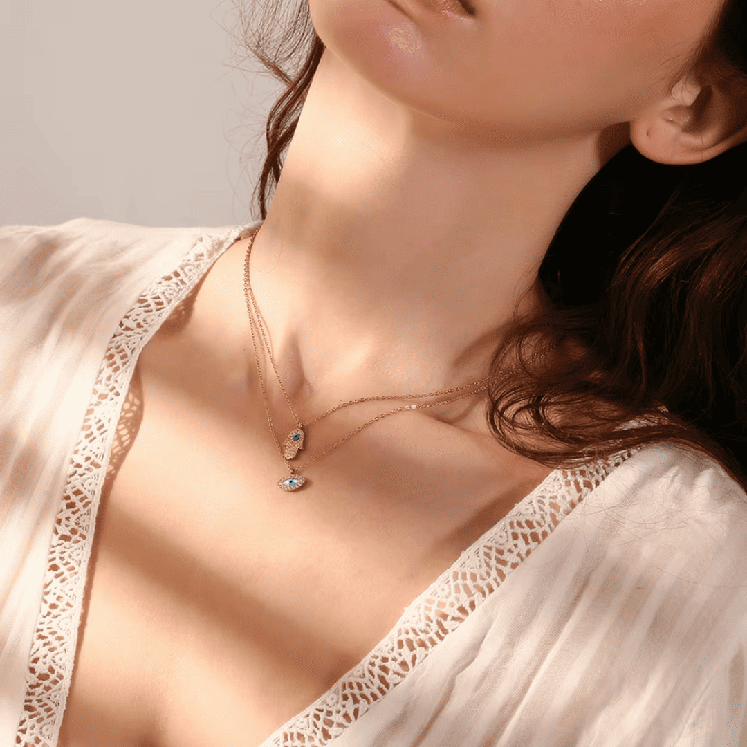 Diese stilvolle Evil Eye Halskette vereint spirituelle Symbolik mit modernem Design.
